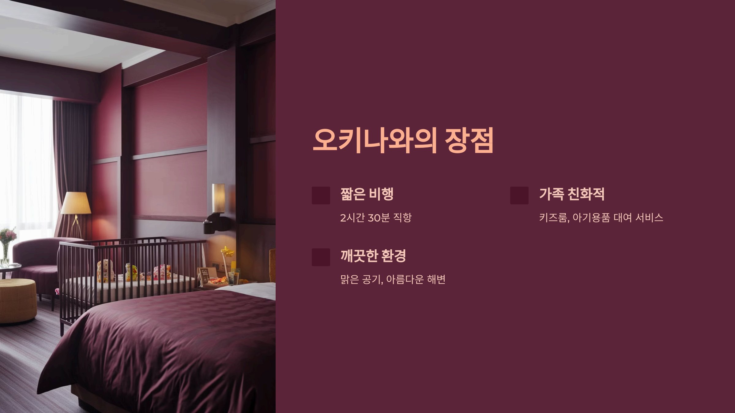 오키나와는 비행 시간이 짧고(약 2시간 30분), 날씨가 온화하며, 아기와 함께할 수 있는 시설이 많아 가족 여행에 적합한 곳입니다.